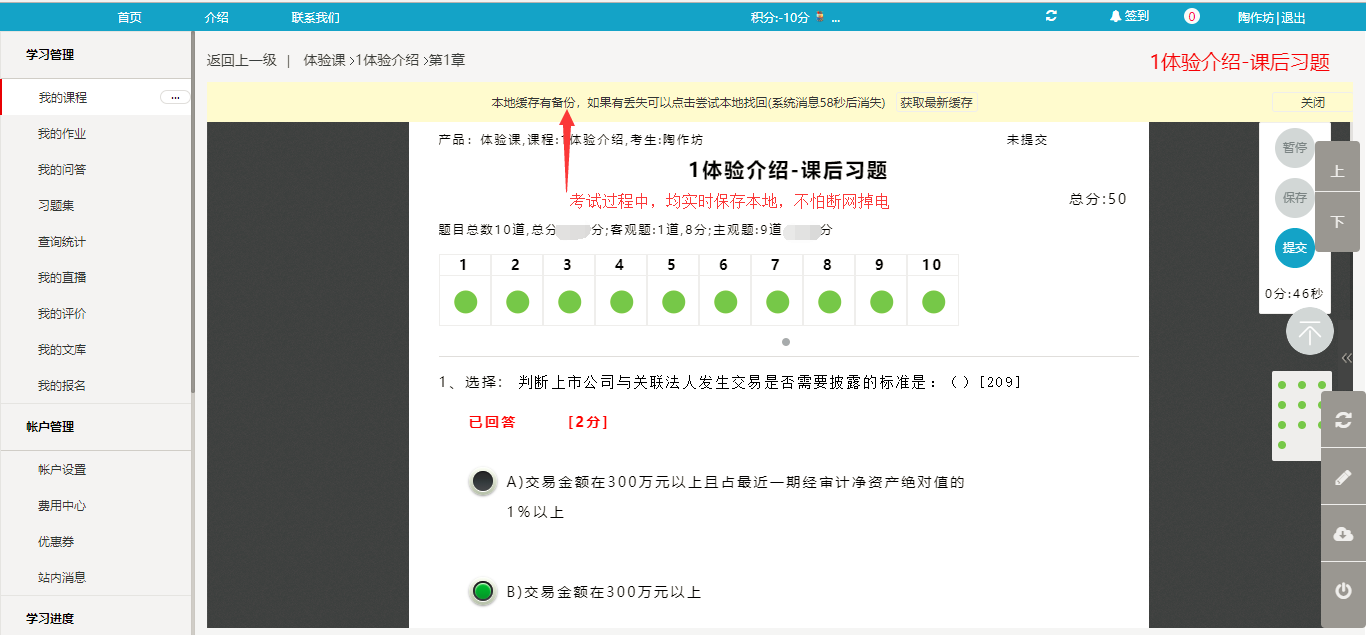 所有答題過程,實時記錄本地,并且無法破譯。斷網后,支持繼續答題,所有題目包括上傳附件均會保留在本地。等網絡通后上傳。掉電重啟也不怕,所有答題都會保留 ,限時考試計時也會繼續計時